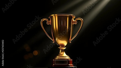 A prestigious golden trophy with a polished, reflective surface stands tall against a deep black background.