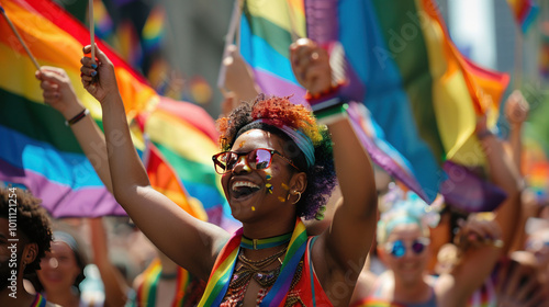 A pride celebration with people from various LGBTQ backgrounds waving flags and sharing joy.