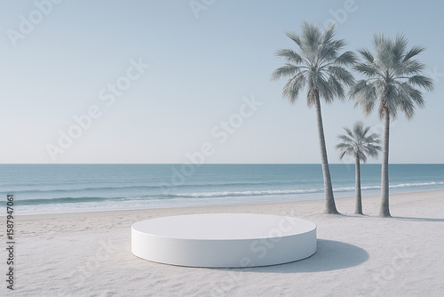 A pristine beach with a minimalist white product display, perfect for tropical summer product showcasing
