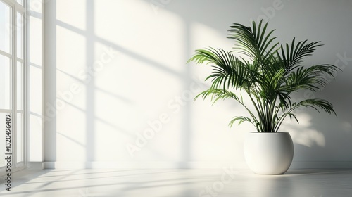 A pristine office space, its white walls bathed in natural light, serves as a blank canvas for your creative visions. A sleek potted plant adds a touch of nature to the modern, clean aesthetic.