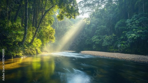 A pristine river cutting through a dense rainforest