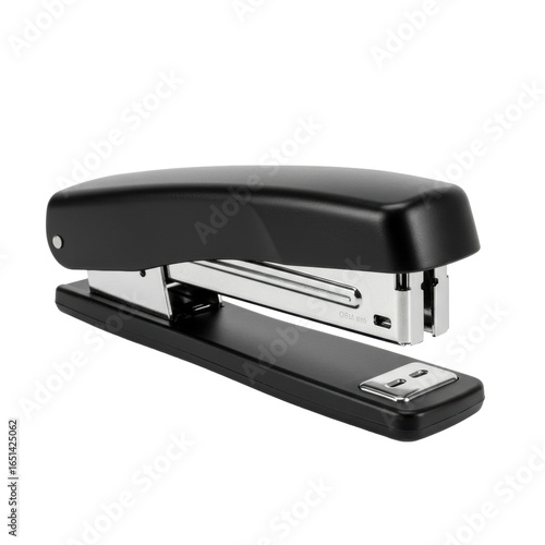 A pristine, unused matte black office stapler with polished silver mechanism, 3/4 view on transparent isolated background, bright studio lighting, no shadows, concept of office supplies and precision