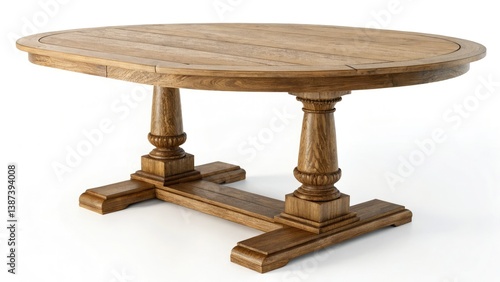A pristine white background showcases a photorealistic 3D render of a wooden table with remarkable depth of field.