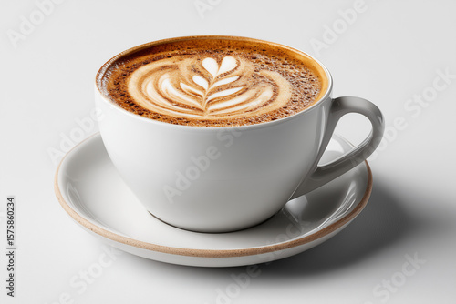 A pristine white cup filled with beautifully crafted latte art, featuring a delicate leaf design on a rich, foamy coffee surface, presented on a matching saucer against a clean background.