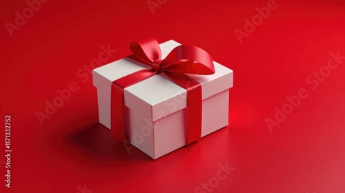 A pristine white gift box adorned with a vibrant red ribbon, sitting elegantly on a solid red background.