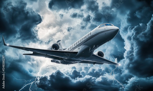 A private plane or jet flies against the backdrop of a gloomy and terrifying stormy sky with swirling dark clouds, an epic panorama with the plane and sky, generated by AI