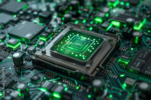 A processor with a green and silver design and a bio system on it