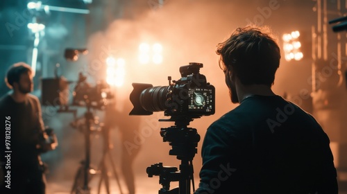 A professional actor delivering lines during a film shoot, surrounded by cameras, lights, and crew.