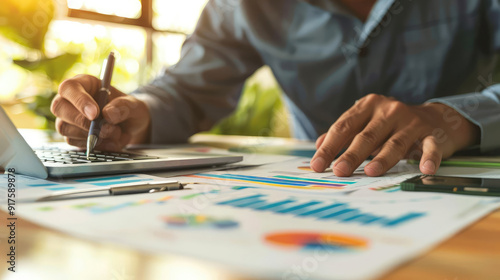 A professional analyzes charts and data on a laptop while taking notes, reflecting a modern workspace environment.