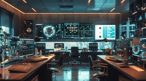 A professional and organized office with a quantum computing lab and advanced simulations