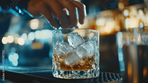 A professional bartender is preparing an alcoholic cocktail with ice cubes to customers at the bar or disco club.