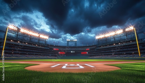 A professional baseball stadium with lights shining down on the field, lush grass in front of home plate