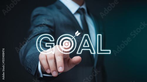 A professional business photo of a hand in a dark suit touching a glowing holographic GOAL text with a target icon.