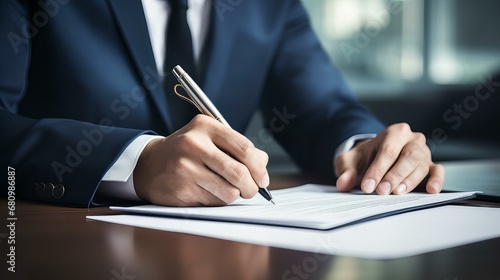 A professional businessman in a suit signing a contract, symbolizing success and legal agreements in a corporate office setting.