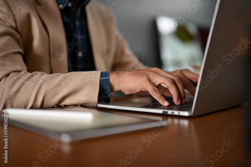 A professional businessman typing on keyboard, using his laptop computer at his desk.