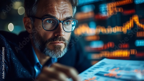 A professional businessman wearing glasses, sitting at a boardroom table, highlighting key financial figures in a printed report, a digital wall displaying stock market movements in the background,