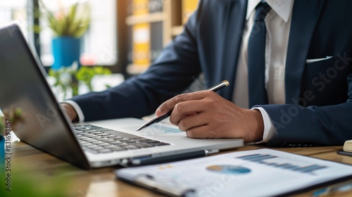 A professional conducting a virtual meeting via Zoom, with a laptop, notepad, and pen on a tidy desk, symbolizing remote work efficiency