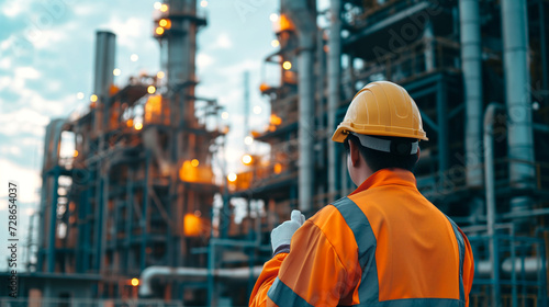A professional engineer in a hard hat and high-visibility jacket observes the complex operations of a petrochemical plant.
