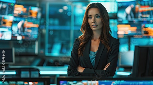 A professional female presenter reporting on a live news program, addressing business, economy, and entertainment
