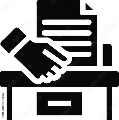 A professional handshake icon with a background of a desk and documents