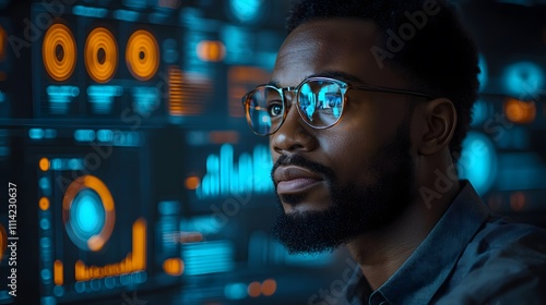 A professional highlighting business target goals, large digital screen with visual data, group discussion, innovative business environment
