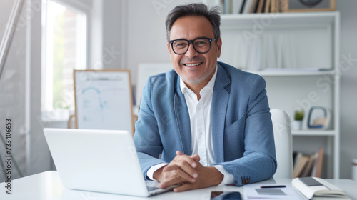A professional in a light blue blazer is working on a laptop at a modern office desk, exuding confidence and satisfaction with their work.
