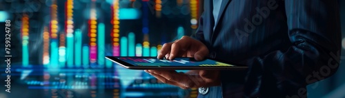A Professional in a suit holding a tablet with a dynamic 3D graph
