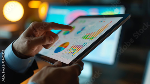 A professional is analyzing financial data on a tablet, interacting with charts and graphs displayed on the screen in a corporate setting.