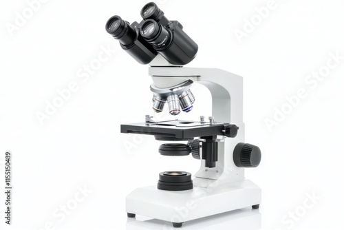 A professional laboratory microscope with dual eyepieces and multiple objective lenses on a clean white background.