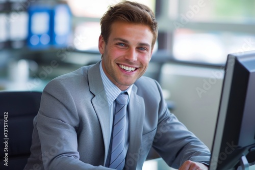 A professional man exudes confidence and happiness as he works diligently on his computer in a modern office setting