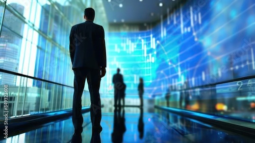A professional man gazes at illuminated stock market graphs in a modern high-rise office building environment