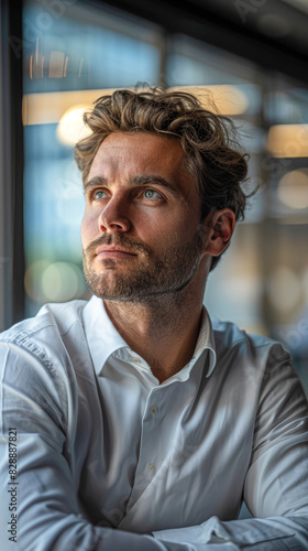 a professional man in a moment of introspection in a busy office, natural light casting soft shadows on his face