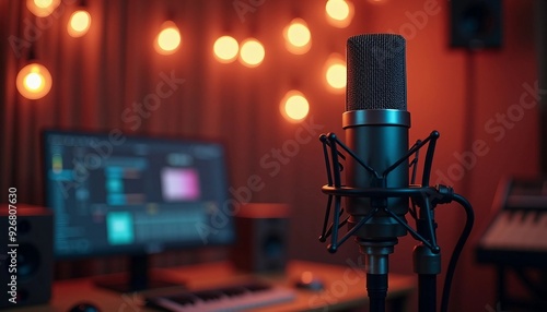 A professional microphone is prominently displayed in a music studio, with studio equipment blurred in the background.