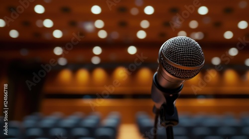 A professional microphone stand positioned in front of a stage, ideal for concerts, performances, and presentations