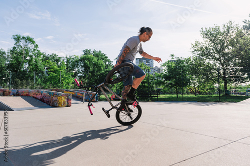 A professional middle-aged tattooed bmx bike rider is performing freestyle tricks in a skate park on a sunny summer day.