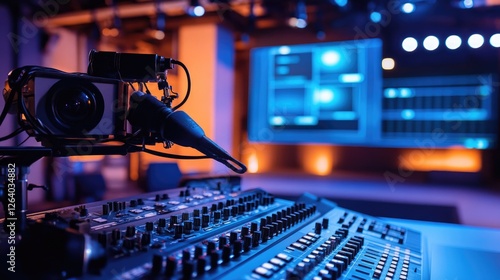 A professional news broadcast studio with equipment set up for live broadcasts, featuring a modern design and technology for news production.