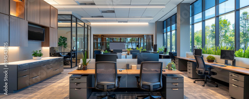 A professional office space with LED lighting, showcasing clean lines, high-tech equipment, and comfortable workspaces, designed for a productive and efficient workday.