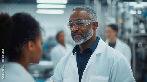 A professional person in a lab coat engages with a colleague, showcasing collaboration in a scientific environment.