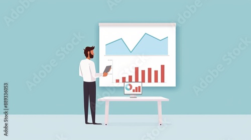 A professional presenting a complex idea on a computerized whiteboard, with high-tech holographic charts and graphs illustrating the concept, flat design illustration