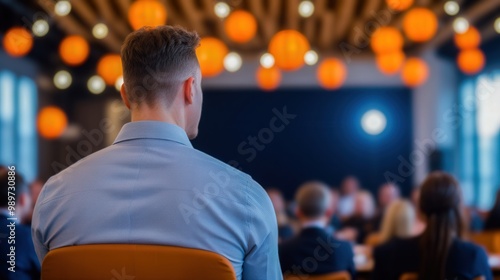 A professional setting with a person seated, facing a gathering under warm, decorative lighting, conveying a sense of focus and engagement in the atmosphere.