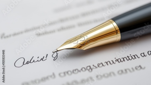 A professional signing scene captured in sharp detail, highlighting the pen movement on a crisp document with copy space