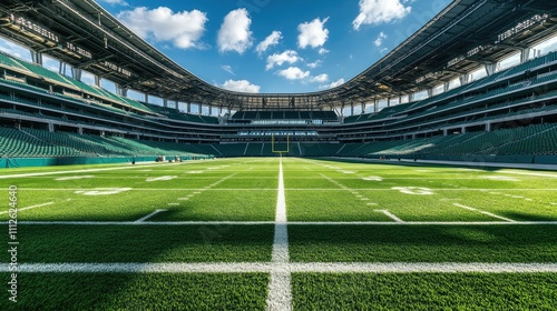 A professional stadium football field seen from the stands, with vivid green turf and empty seating