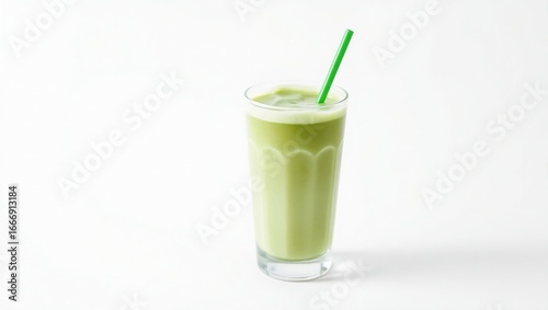 A professional studio shot of a vibrant green smoothie in a glass with a green straw. The drink sits on a white surface with a minimalist white background.