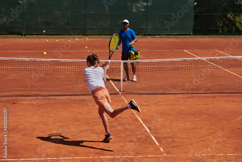 A professional tennis player and her coach training on a sunny day at the tennis court. Training and preparation of a professional tennis player