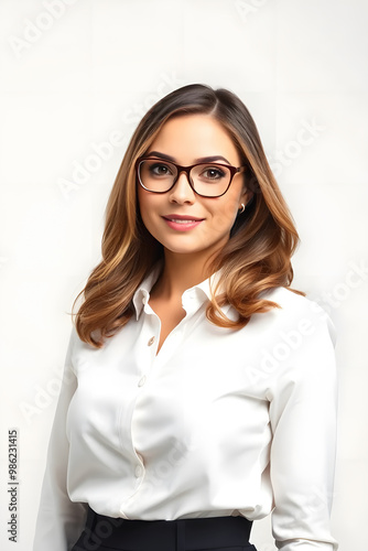A professional woman with long, wavy brown hair wearing glasses and a white blouse. She has a warm smile and is posed against a light, neutral background, exuding confidence and professionalism.