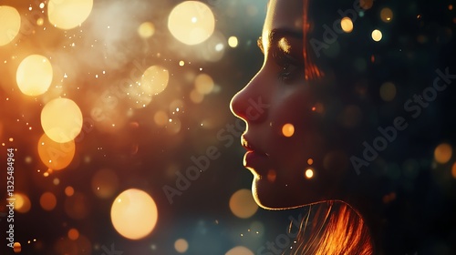 A profile of a woman surrounded by glowing bokeh lights, creating a dreamy atmosphere.