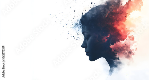 A profile view of a woman transitions into a burst of colorful particles, symbolizing creativity and imagination. The vibrant hues contrast with the dark silhouette, creating a striking visual.