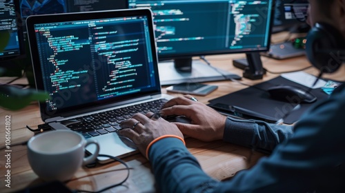 A programmer engrossed in coding, surrounded by multiple screens and a cup of coffee, embodies late-night dedication and focus.
