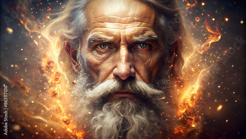 A prophet of God with white beard in a fire and flames effects background illustration