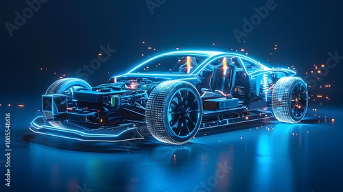 A prototype racing car with stunning blue and red lights. High-speed prototype car glowing in blue and red shades. Futuristic prototype racing car glowing in blue and red hues.